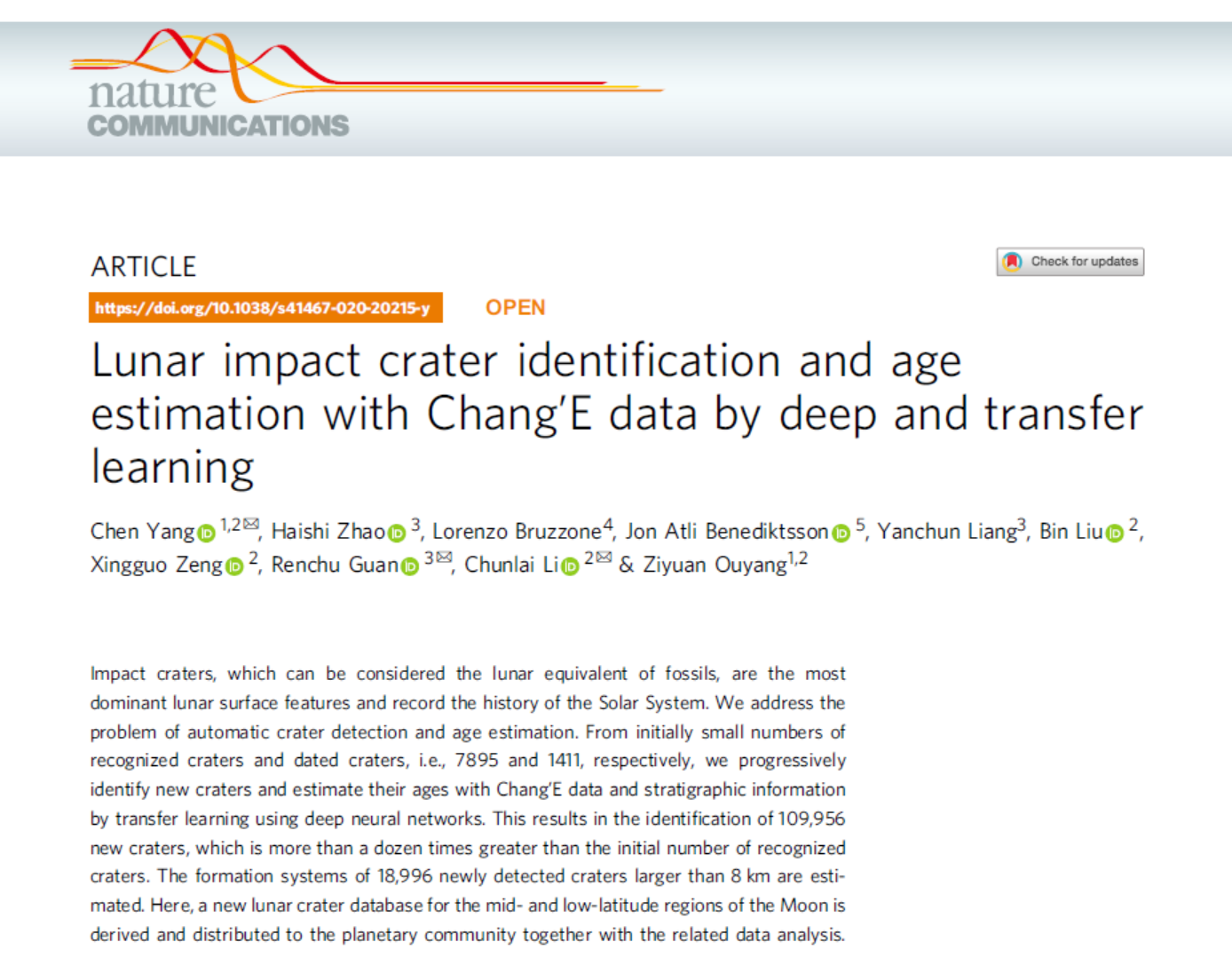 best365官方网站登录入口杨晨副教授联合best365官方网站登录入口计算机科学与技术学院管仁初教授研究组、中国科学院国家天文台月球与深空探测重点实验室欧阳自远院士团队,在月球撞击坑智能识别和年代标定方面取得突破性进展。研究成果以“Lunar impact craters identification and age estimation with Chang'E data by deep and transfer learning(DOI: 10.1038/s41467-020-20215-y)”为题,于2020年12月22日作为亮点文章发表于Nature子刊《Nature Communications》(文章链接:https://www.nature.com/articles/s41467-020-20215-y)。目前,研究成果被新华网、中国新闻网、NBC News、Popular Science、German Press Agency、Live Science、US News和CNN Digital等多家新闻媒体采访和报道。
