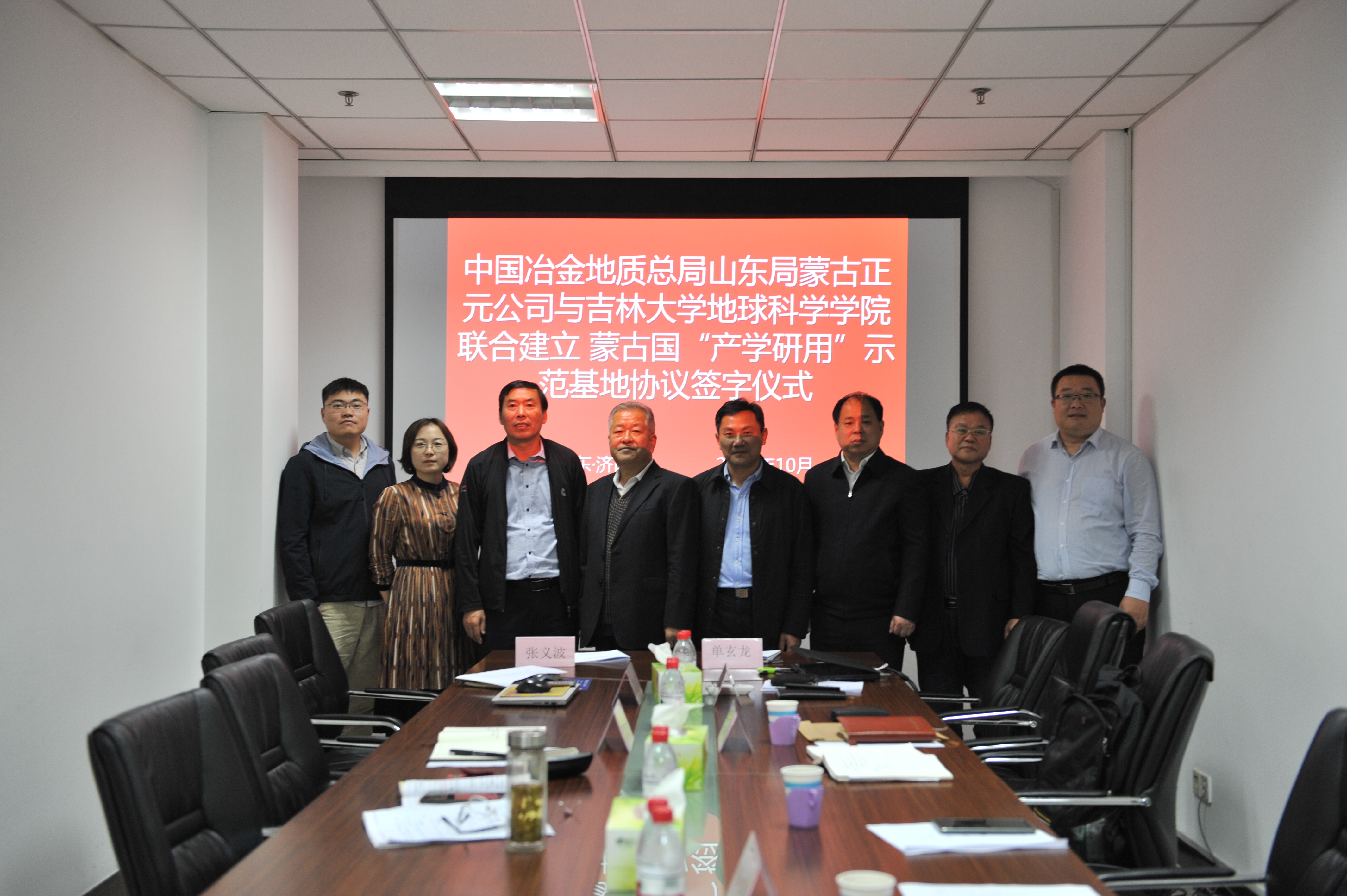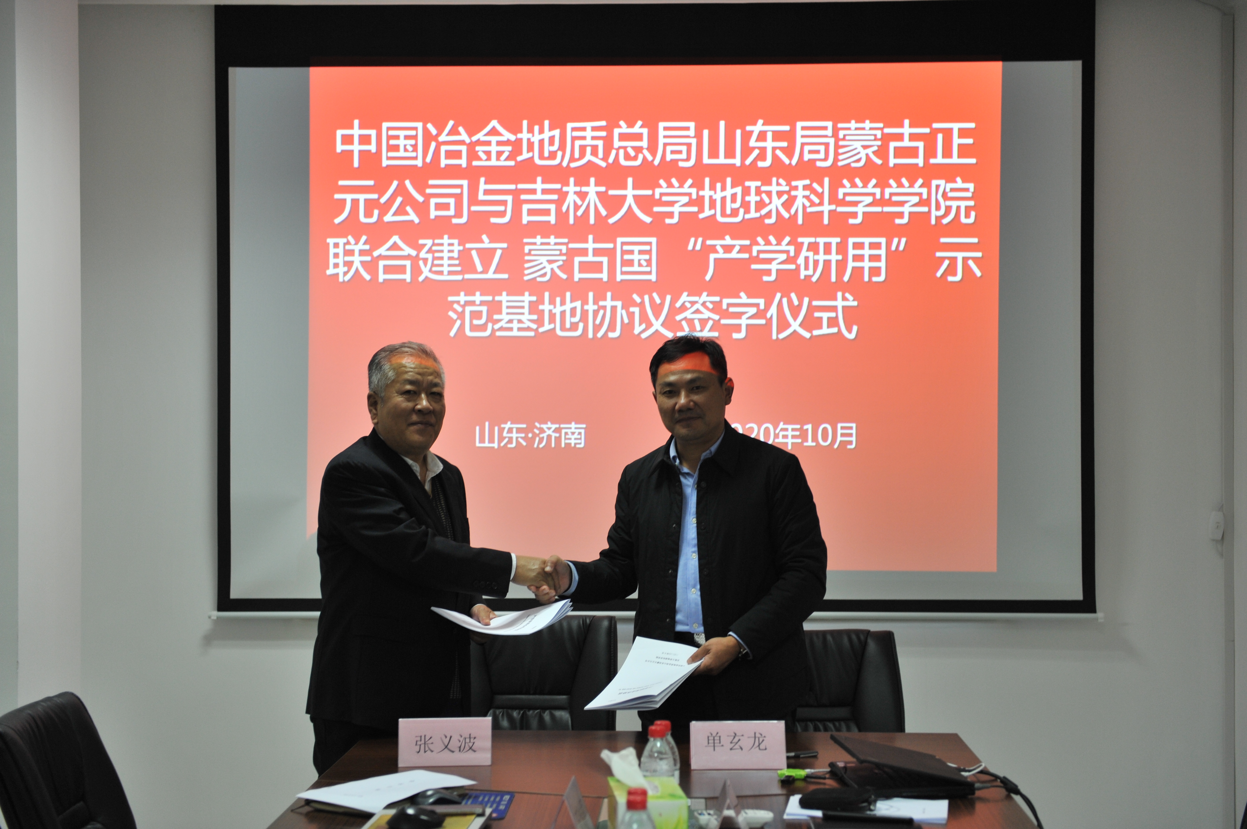 2020年10月16日,best365官方网站登录入口院长单玄龙、党委书记杨洲等一行三人到蒙古正元公司进行交流座谈,双方就人才培养、联合立项、地质成果研究等多个方面展开讨论并达成共识。会间,双方签署了共建蒙古国“产学研用”示范基地协议。山东局地质科技部副主任谭延斌、蒙古正元公司总经理张义波等出席会议。