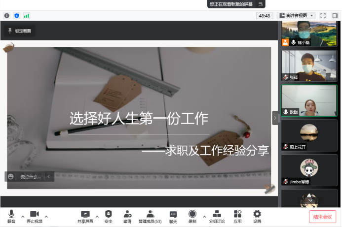 为持续贯彻党中央、国务院“稳就业”、“保就业”决策部署,积极响应学校“为民服务办实事,聚力增效促就业”的工作要求,缓解疫情冲击下严峻的就业形势,帮助学院研究生找准个人就业定位、理清就业思路、做好就业规划。地球科学学院于4月16日开展第二期研究生“云端分享,行业引路”主题线上就业分享会。本期研究生云端就业分享会,以学生需求为导向,着力增强专业认同感,发挥校友及朋辈力量,邀请我院2021届优秀校友冷柚兵和耿聪以及2019级硕士研究生沈梦蓉从定向选调(参与西部计划)、专业对口与跨专业就业三个方面与全体研究生进行分享。本次活动由学院兼职就业辅导员褚小磊主持。