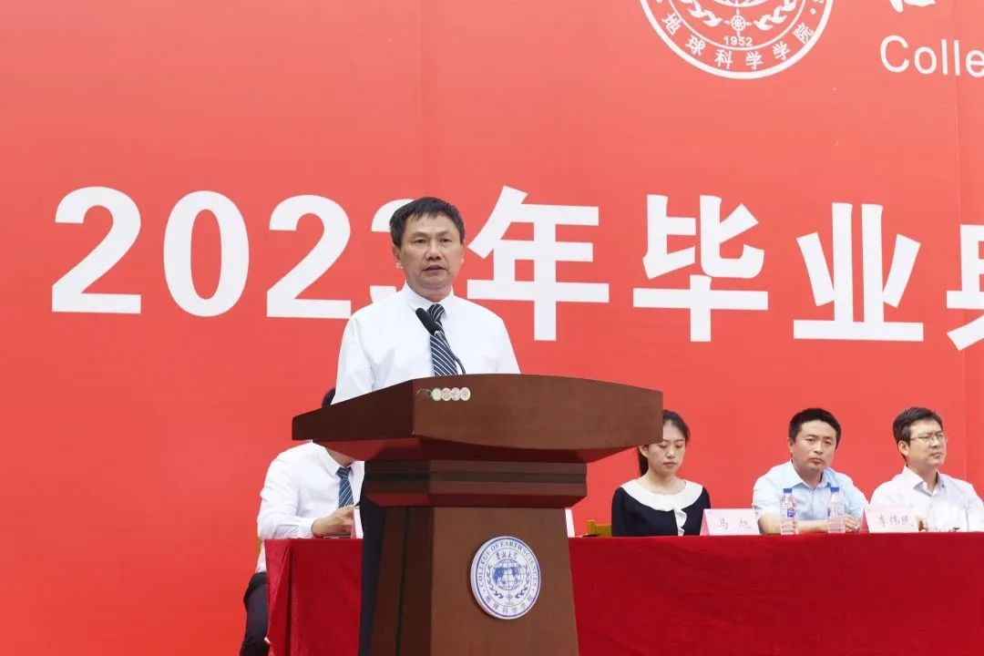 在院长致辞环节,单玄龙院长为所有毕业生致以真挚的祝福。23届的毕业生是最特别的一届毕业生,大学四年疫情就占了三年,但同学们在这场历史考验中顾大局、识大体、明大义,克服了种种困难完成了学业。惟其艰难,方显勇毅;惟其磨砺,始得玉成。同学们在人生最美好的年华,来到吉大,逐梦远航,与学院共同成长。回望来时路,你们与伟大时代“双向奔赴”,展望新征程,这方校园,再次成为你们人生的新起点,你们即将扬帆起航,开启新征程,希望你们无论何时,都要不忘地学荣光,手握科技报国的“爱国锤”;无论何时,都要不忘地质初心,手持恪守自我的“人生罗盘”;无论何时,都要不忘地学理想,手执追求卓越的“奋斗放大镜”。此去当是良辰美景;他日归来,仍当是少年。有朋自远方来,又赴远方,但无论远方有多远,鸽子楼永远是你们的摇篮!