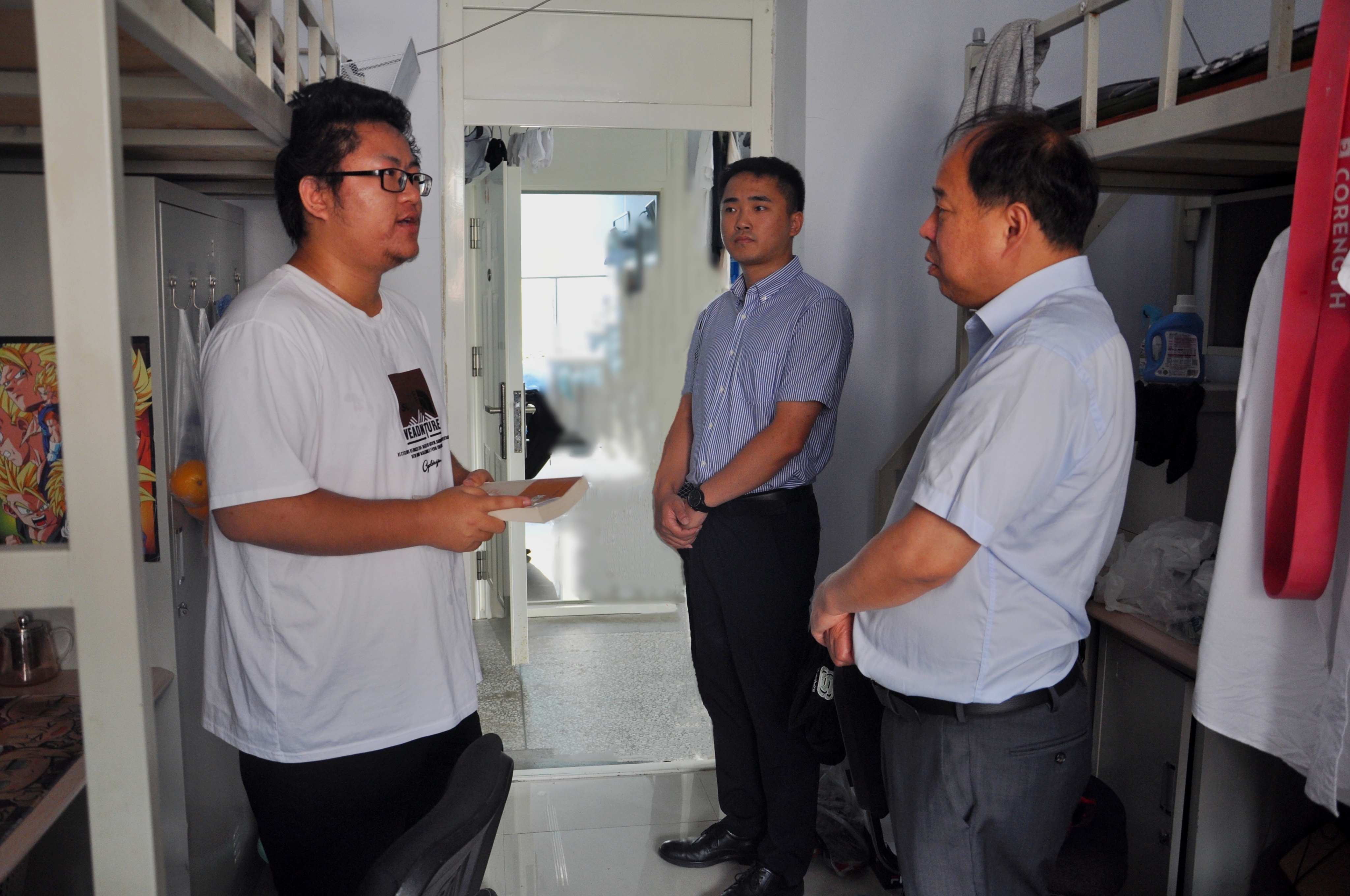秋风去暑气,关怀为学生。为深入了解研究生新生到校适应情况,掌握研究生思想动态,解决实际问题,帮助研究生尽快融入学习和生活,9月4日上午,学院党委书记杨洲、党委副书记马旭、研究生辅导员姜鹏一起深入研究生新生寝室走访慰问。