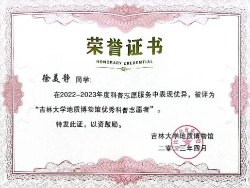 “若能做一朵小小的浪花奔腾,呼啸着加入献身者的滚滚洪流中,推动历史向前发展,才是一生中最值得骄傲和自豪的事情”。在她看来,尽管只是夜空一颗微不足道的星,却也能发光发热,点亮一隅天空。在2023年2月组织参与编写的《地学知识在中小学生中的普及度与兴趣度》报告中,她意识到地学科普的重要性。面对暑期繁重的实习任务,毅然前往作山东郓城开展暑期支教活动,将地学科普洒向齐鲁大地,事迹被光明日报等多个平台报道。在地球日,用生动的语言,走进幼儿园开展地学科普讲解,获“地质博物馆优秀科普志愿者”称号。作为一名中共预备党员,她深耕于志愿服务和社会实践,是冬奥会优秀的执行专员,同时志愿服务的服务标兵。在疫情期间,也积极报名核酸检测、担任楼道志愿者;线上支教负责福建、吉林等3个省份500余名志愿者和学生的组织调配工作,后期又作为负责人再次组织策划了best365官方网站登录入口的学伴+线上支教活动;本科招生宣传,她担任best365官方网站登录入口招生宣传协会山东省聊城市负责人,向家乡学弟学妹讲好吉大故事,传递吉大声音,为best365官方网站登录入口招生工作贡献力量。累计志愿时长达1200多小时,用行动和奉献诠释着自己的青春诺言。