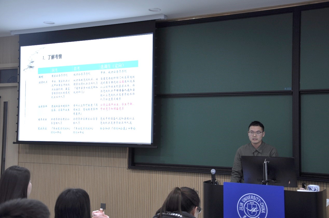 活动上,三位主讲人分别从选调生考试的岗位选择、选调条件、选调程序以及自己的学习安排和备考技巧与在场同学进行了分享。任祚霆提醒同学们要有计划的备考,在保有乐观心态的同时不断提升自己的综合竞争能力。他希望选择参加选调工作作为自己职业规划的同学们一定要不忘初心,要通过服务社会、造福人民的实际行动,来增强作为一名基层选调工作人员的责任感和使命感。赵伍涛着重于面试技巧与大家进行分享,他告诉同学们在选调面试考察环节中要在表达流畅的基础上体现个人自信和思维逻辑的严谨性。汤斯琦结合自己参加辽宁省、吉林省、浙江省三地选调考试内容的差异性告诉同学们要因地制宜准备选调考试,在选调岗位的选择上面,要综合考虑之后做出理性选择,不可人云亦云