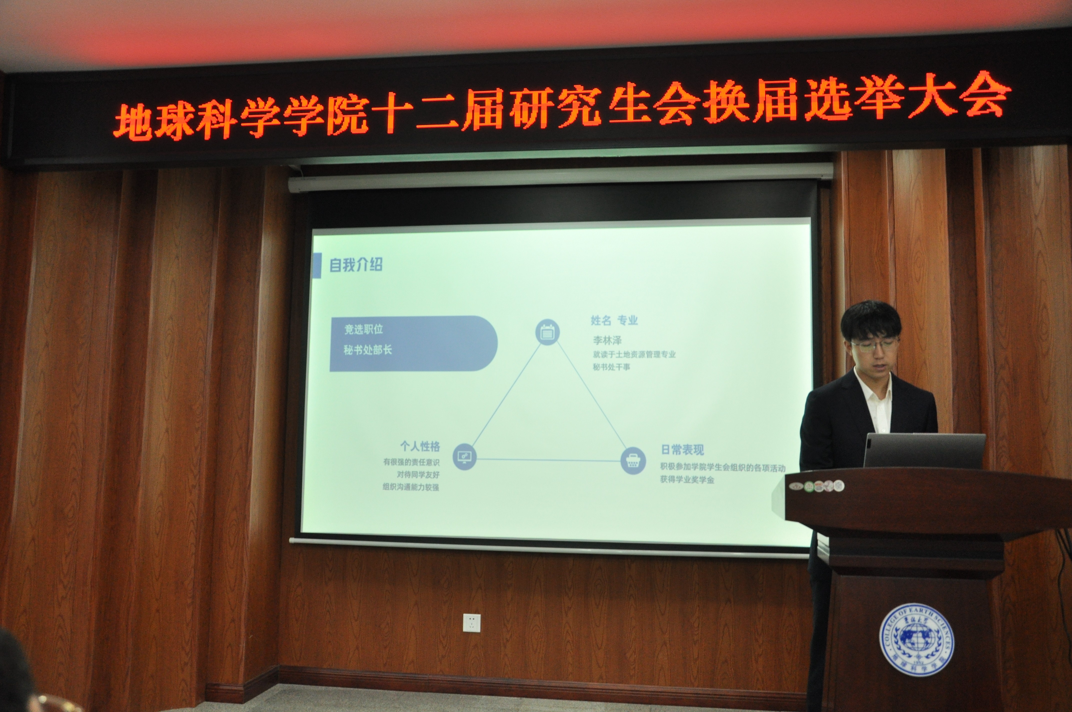 随后,大会进入到换届选举环节。在紧张而有序的竞选演讲环节,各候选人分别从自我介绍、部门及学院工作经历、工作感悟和岗位设想等方面展开论述,展现了对研究生会工作的热情与责任感。最终,在主席团、各部门部长及副部长、参会的非竞选者研究生会成员的投票下,新一届研究生会主席、副主席以及各部门部长、副部长顺利产生。