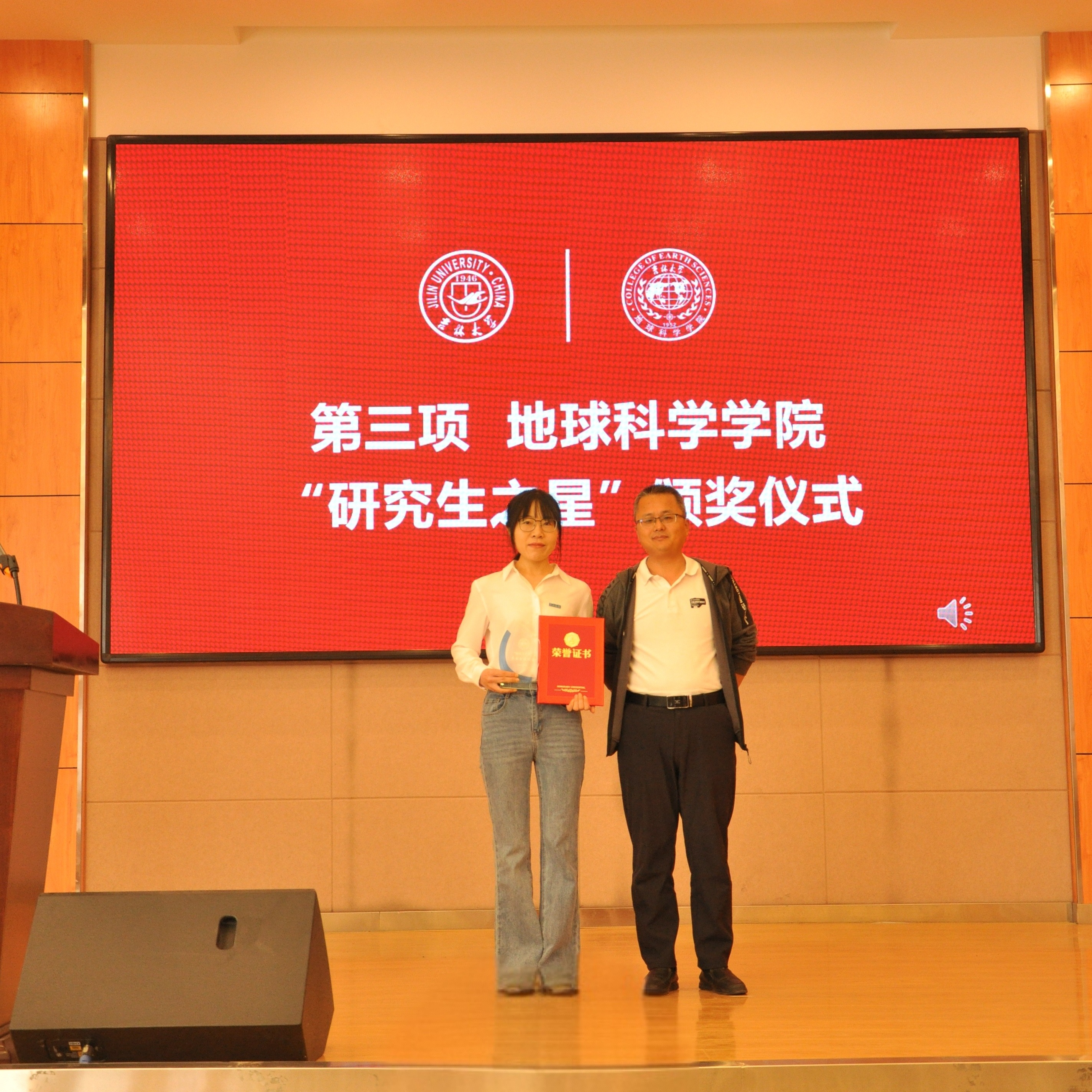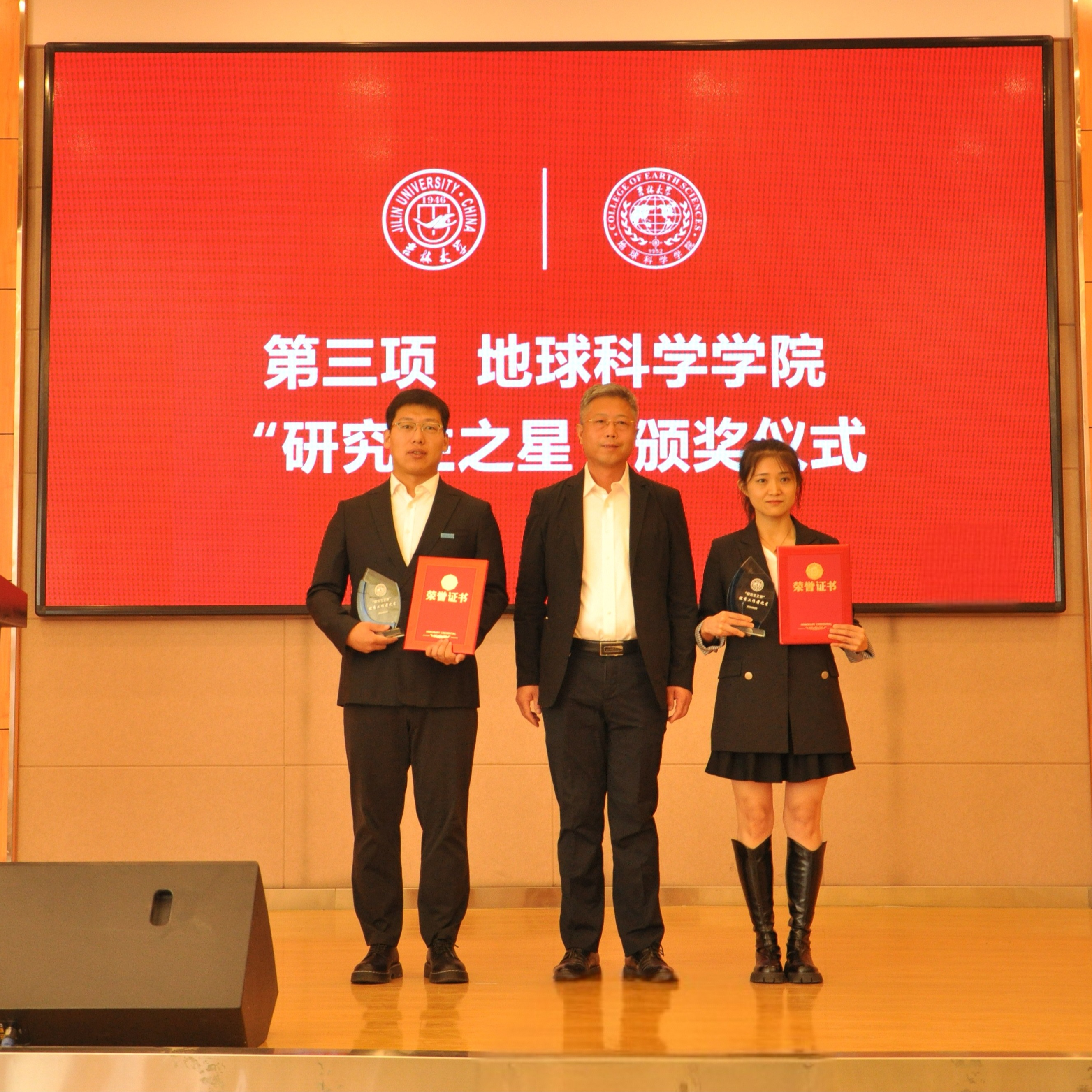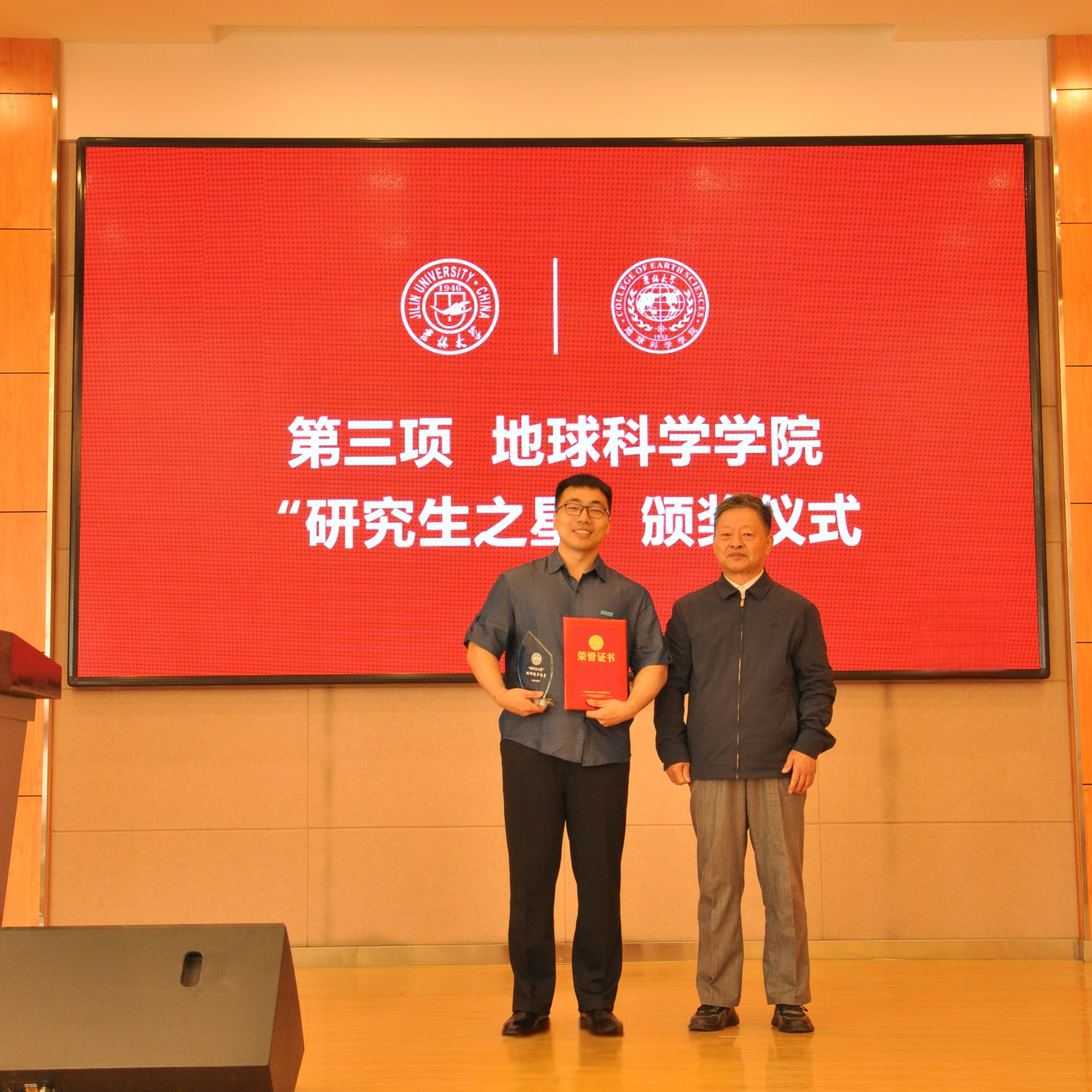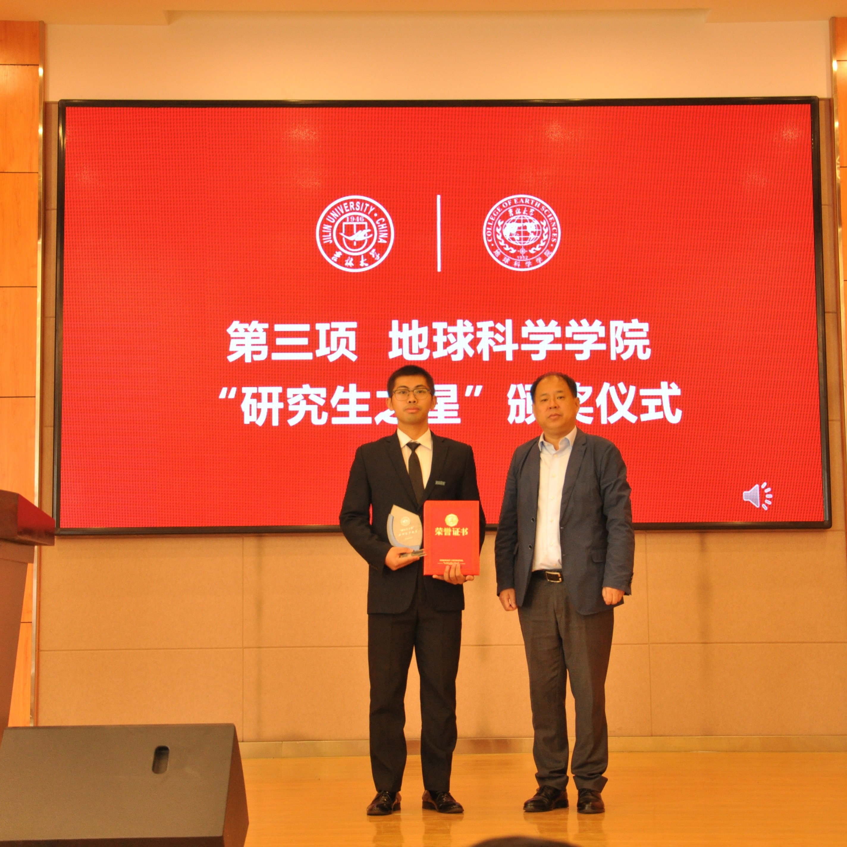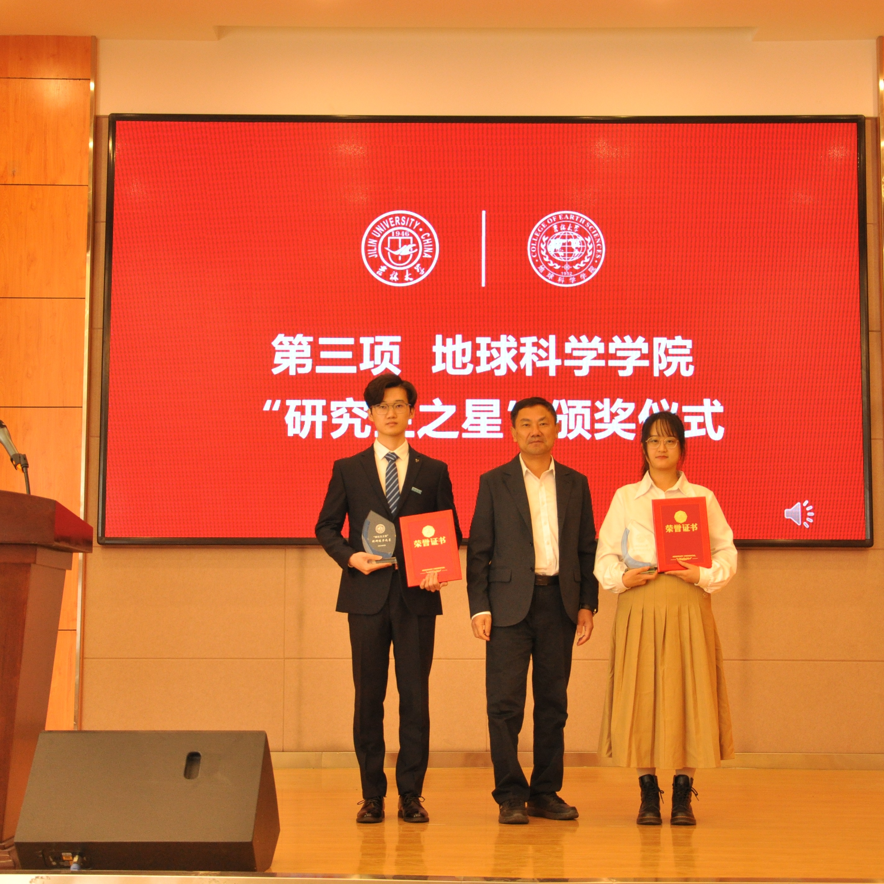 典礼上,副院长柳蓉宣读了《关于表彰王世昌等10名研究生获得best365官方网站登录入口“研究生之星”的决定》。学院党委书记杨洲、学院院长单玄龙,专业学位培养指导委员会主任委员王璞珺、行政副院长苗广文、地质学系主任李世超、国土资源系主任王冬艳、博士生导师杨晨分别为“研究生之星”颁发荣誉证书和奖杯。