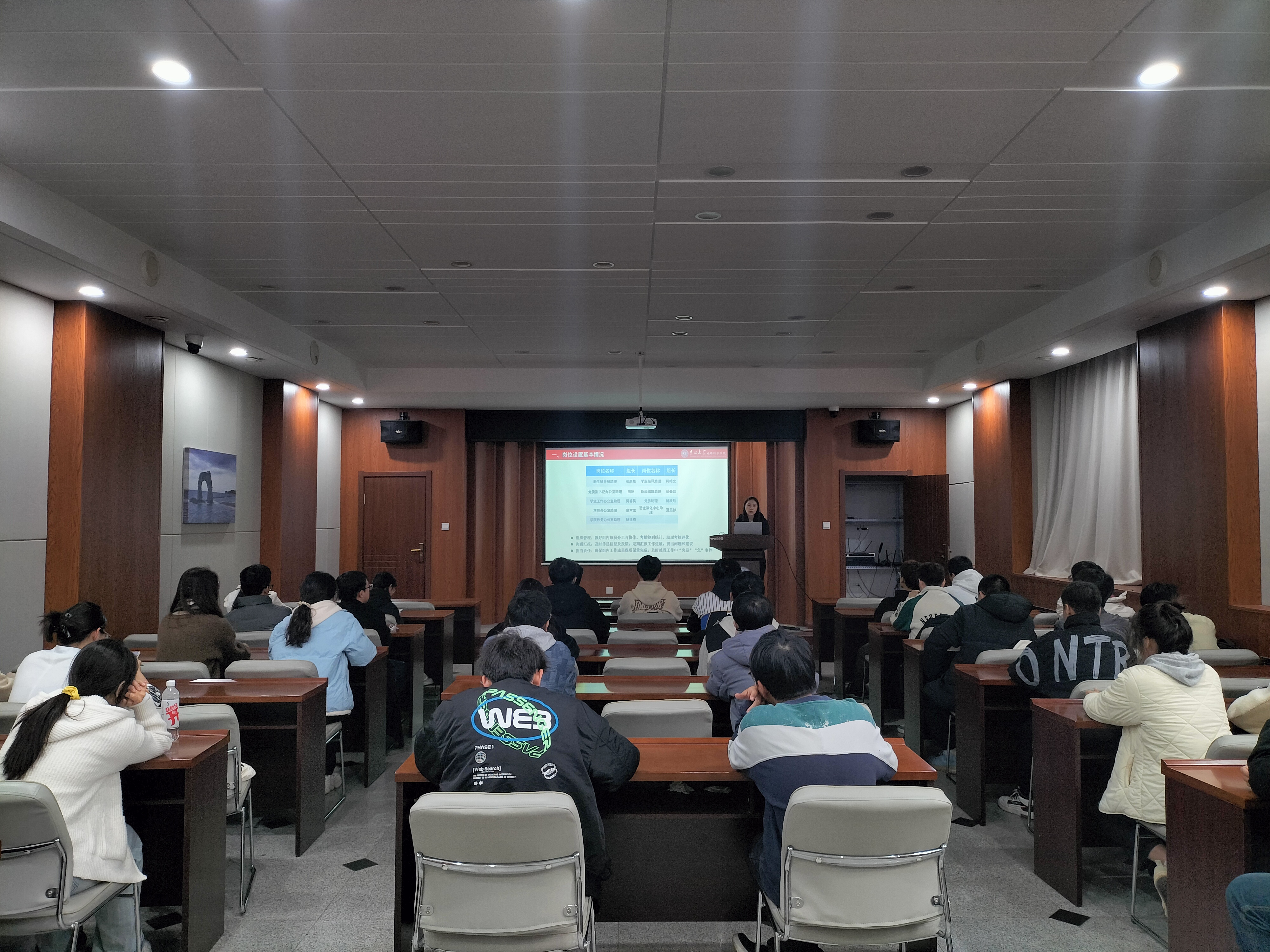 会议伊始,韩旭老师就勤工助学岗位设置基本情况、各岗位负责的内容进行了详细介绍,并介绍了各个岗位的组长,指出组长应做好组织协调工作,及时传递信息沟通汇报,树立责任担当意识。