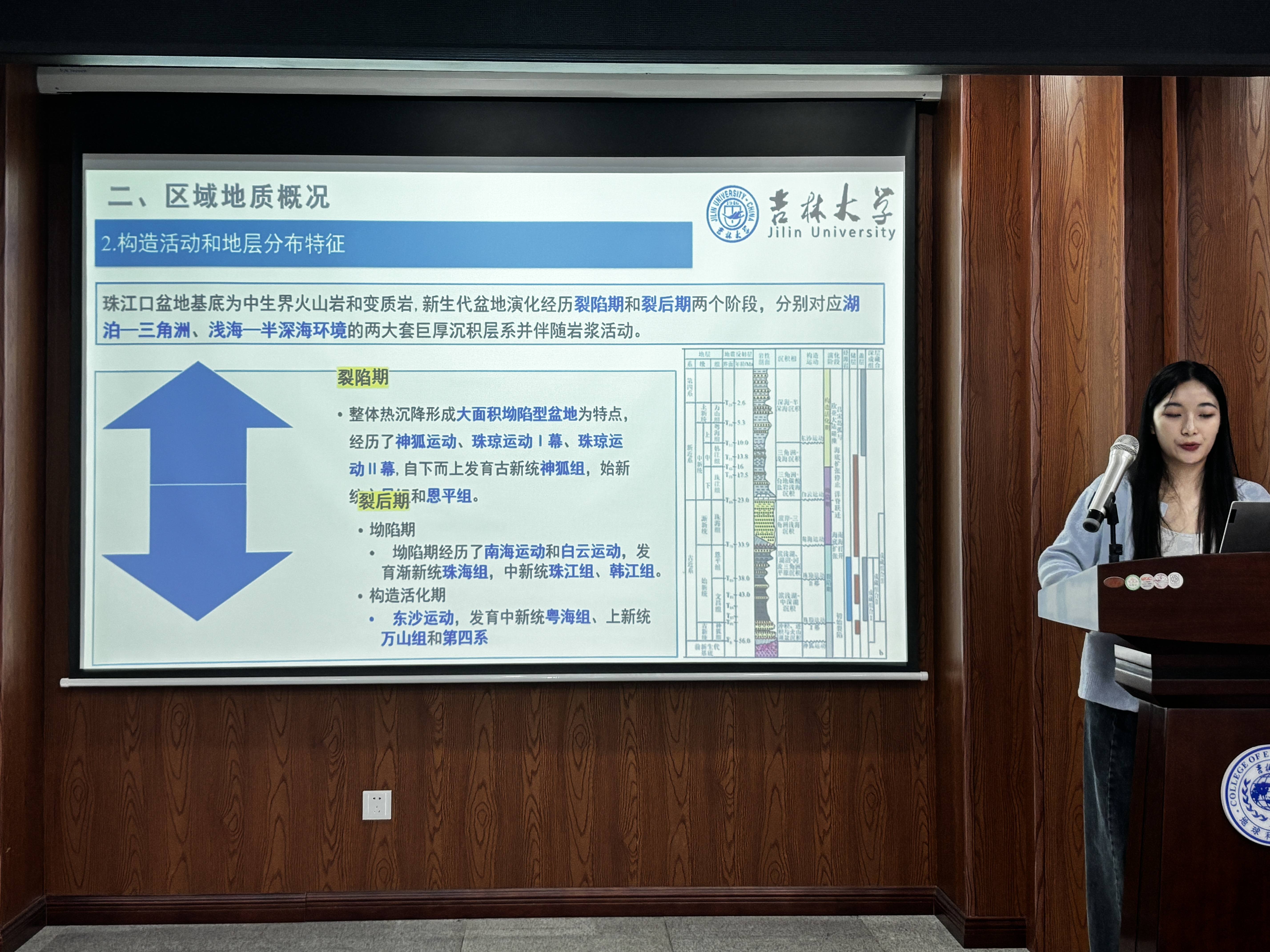 活动马凌同学探讨了白云凹陷区域断裂演化的动力学机制,对白云凹陷裂陷期的断裂样式及平面组合进行详细分析;刘翔宇同学讲述了义县组火山岩地层旋回划分,通过建立旋回厚度与断裂之间的耦合关系判定了其控制因素;蒋迪娅同学通过薄片鉴定、井震结合方法、地球化学资料等综合分析珠江口盆地恩平凹陷西南部火山机构特征及其分布控制因素;朱峻永同学利用地震解释井震结合对准噶尔盆地达巴松凸起石炭系火成岩优质岩性岩相进行区分,查明优质储层主控因素,建立发育模式;张睿晨同学则使用模拟软件,探究断裂活动对火山岩油气藏运聚的控制作用;王志豪同学通过岩石矿物学分析、稀土元素特征研究及三维地震数据体解析等手段,系统揭示白云凹陷始新统古地貌演化及物源展布特征;兰志鹏同学利用钻井结合地震的方法对研究区火山岩进行识别刻画,研究火山岩分布规律控制因素及对油气聚集的影响。