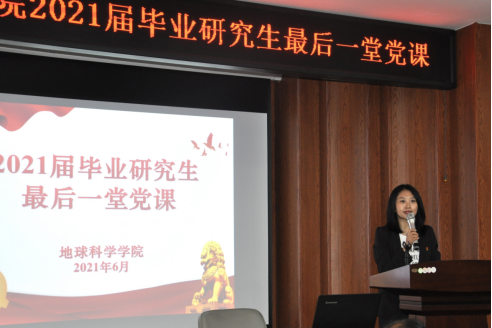 杨洲以历史的三重含义为切入点,带领学生党员系统回顾了中国共产党的发展历程和百年来伟大的民族精神。围绕中国当今时代的发展背景以及在国际社会中的重要地位,告诉学生党员一定要在时代中找到属于自己的发展坐标,发挥专业优势,明确奋斗目标。鼓励毕业研究生党员要学以报国,学以强国,将个人命运与国家命运相结合,发扬地学人敢于吃苦,甘于奉献,勇于创新的科研精神。追求人生“四个”新境界,将自身专业技能的提升与思想境界的提升相统一,做到“立大志、明大德、成大才、担大任”,努力让自己成为堪当民族复兴重任的新时代有为青年。