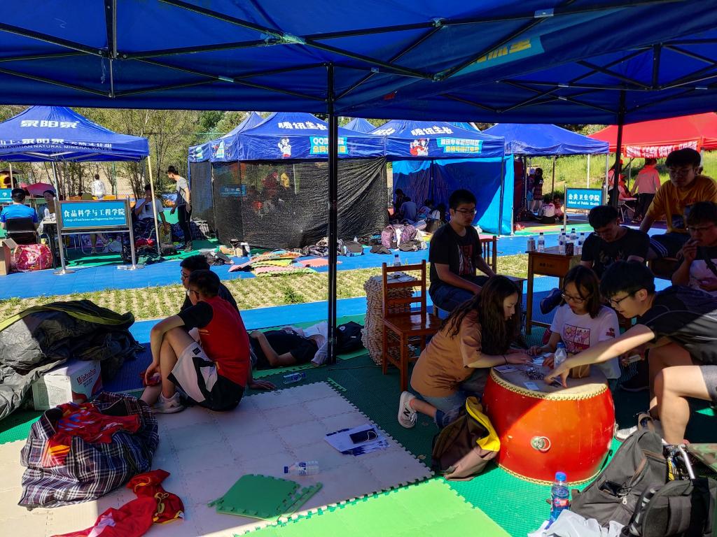 一大早,有项目的学生便来到学院在操场的搭建的棚子里,他们有的安排场地,有的整理服装,有的热身运动。原本安详静谧的篮球场一瞬间就变得热闹非凡。