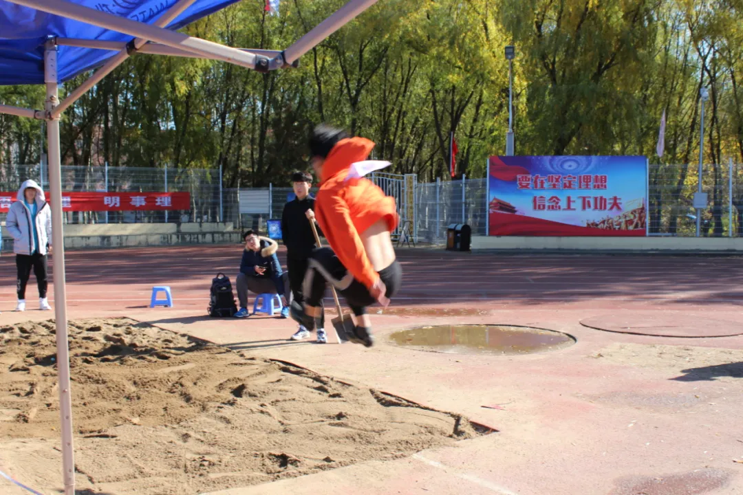 田赛方面,上午8:30男子跳远项目开始啦。参加该项目的是叶润旭同学。尽管天气转凉,可这无法减弱他如火的热情。熟悉跑道、协调节奏、热身、起跑、腾空、落地,划出一道完美的抛物线。最终取得了第六名的好成绩!